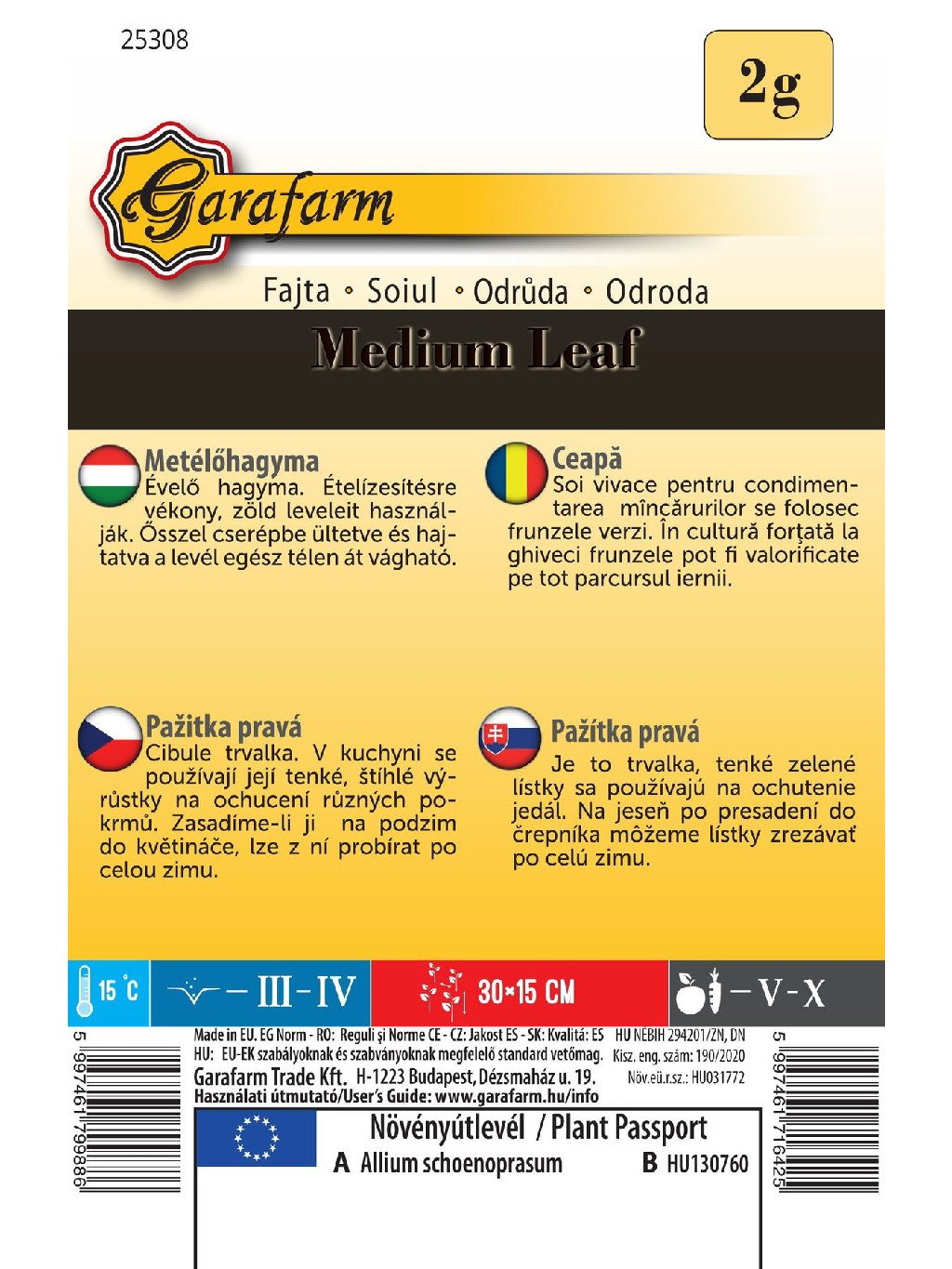 Výsev: od marca až do apríla. Doporučovaná vzdialenosť riadkov je 35 cm, vzdialenosť semien 15 cm.
