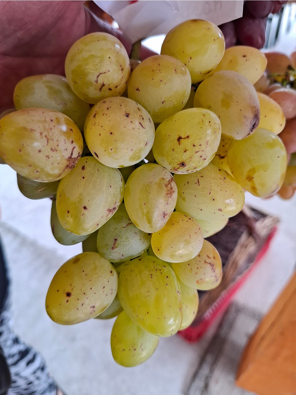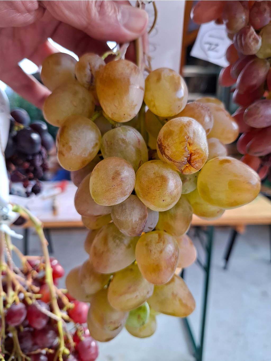 Termése | Fürtjei nagyok, 500 - 600 g. Bogyói nagyon nagyok, 15 - 20 g, borostyán sárgák. Húsos, enyhén muskotályos, roppanós. Cukortartalma 16-19°NM. Nagyobb fürtjei elérhetik a 1,5 kg-ot, egy tőről akár 7 kg termést szüretelhetünk. |