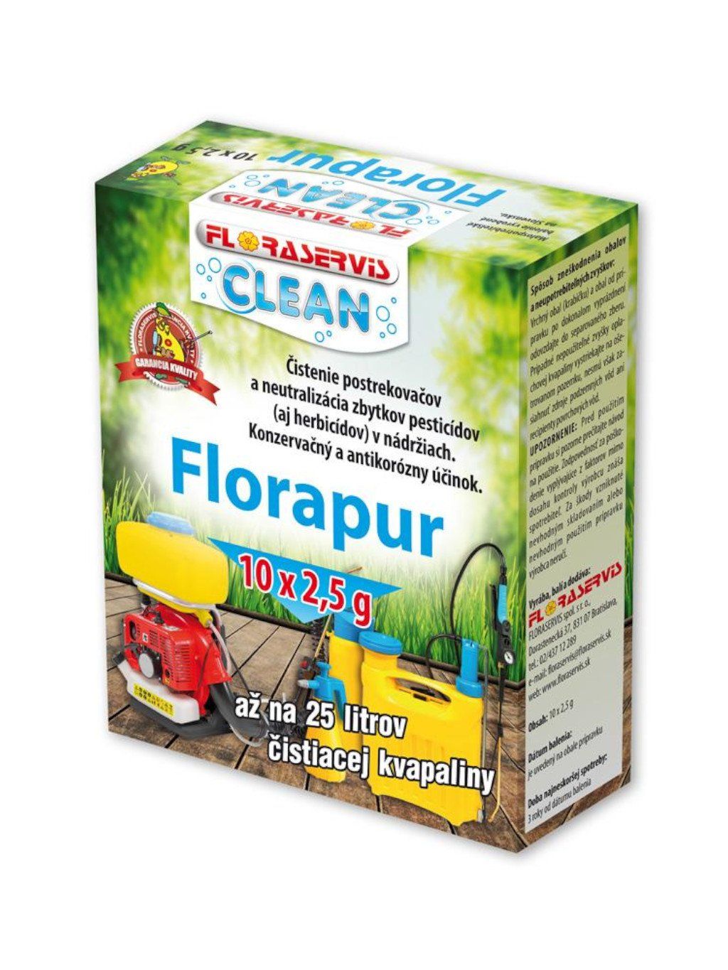 Použitie: Prázdny postrekovač vypláchnite vodou, potom naplňte roztokom prípravku Florapur (dávka 2,5gna 2,5 litra vody.) Postrekovač pretrepte, natlakujte a vystriekajte. Florapur nie je fytotoxický a je biologicky odbúrateľný, preto je možné roztok vystriekať na ošetrený pozemok. Postrekovač už následne neoplachujte vodou, pretože tým odstránite ochranný antikorózny film!