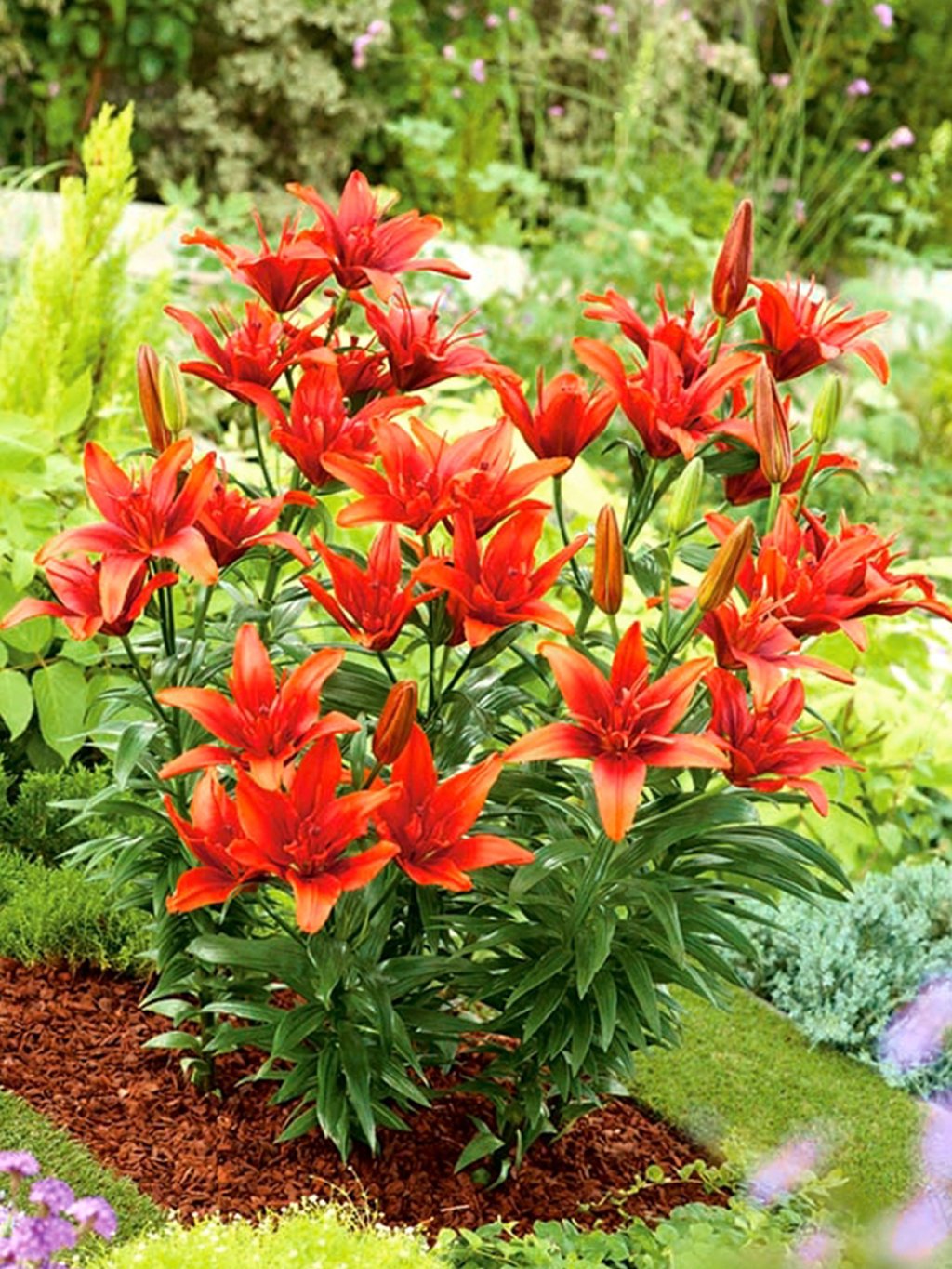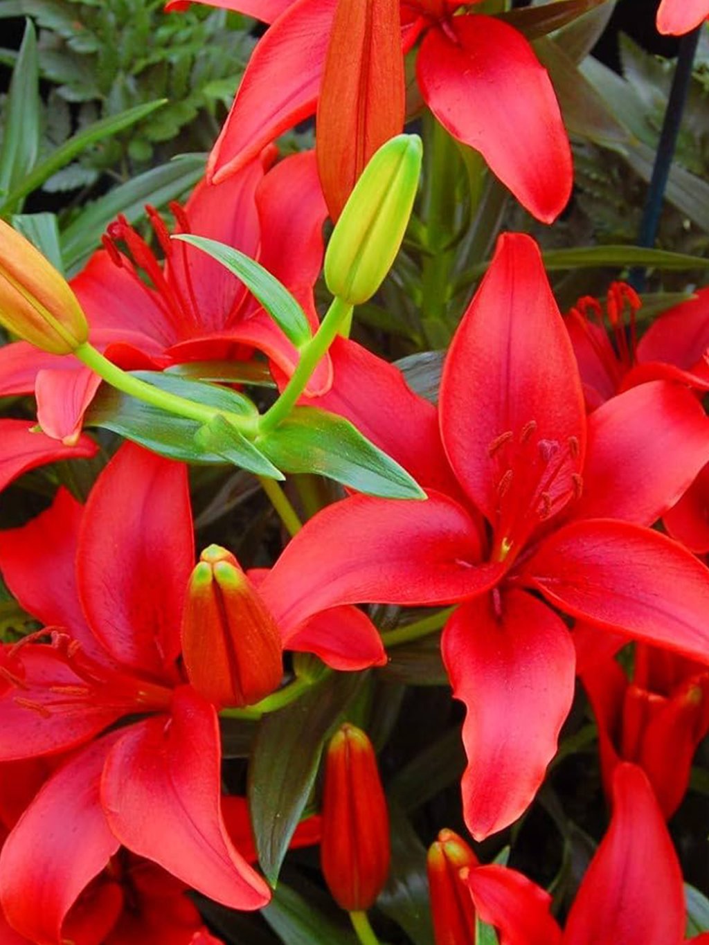 A 'Lilium Asiatic Red' egy gyönyörű ázsiai liliom, jellegzetes, élénk vörös virágokkal. A virágok nagyok, harang alakúak, és feltűnőek intenzív színükkel, amely energiát és szépséget hoz a kertbe. Cserepes ültetéshez vagy csokorba kötve is kiváló fajta. Ez a liliom egész nyáron virágzik, alkalmas napos vagy félárnyékos helyeken történő termesztésre.