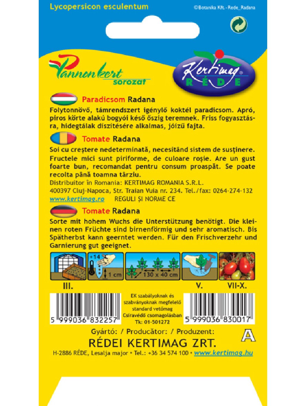 Vetése: üvegházban már márciusban, a talaj ideális hőmérséklete 14°C. A növények közti ajánlott távolság 130 x 40 cm.