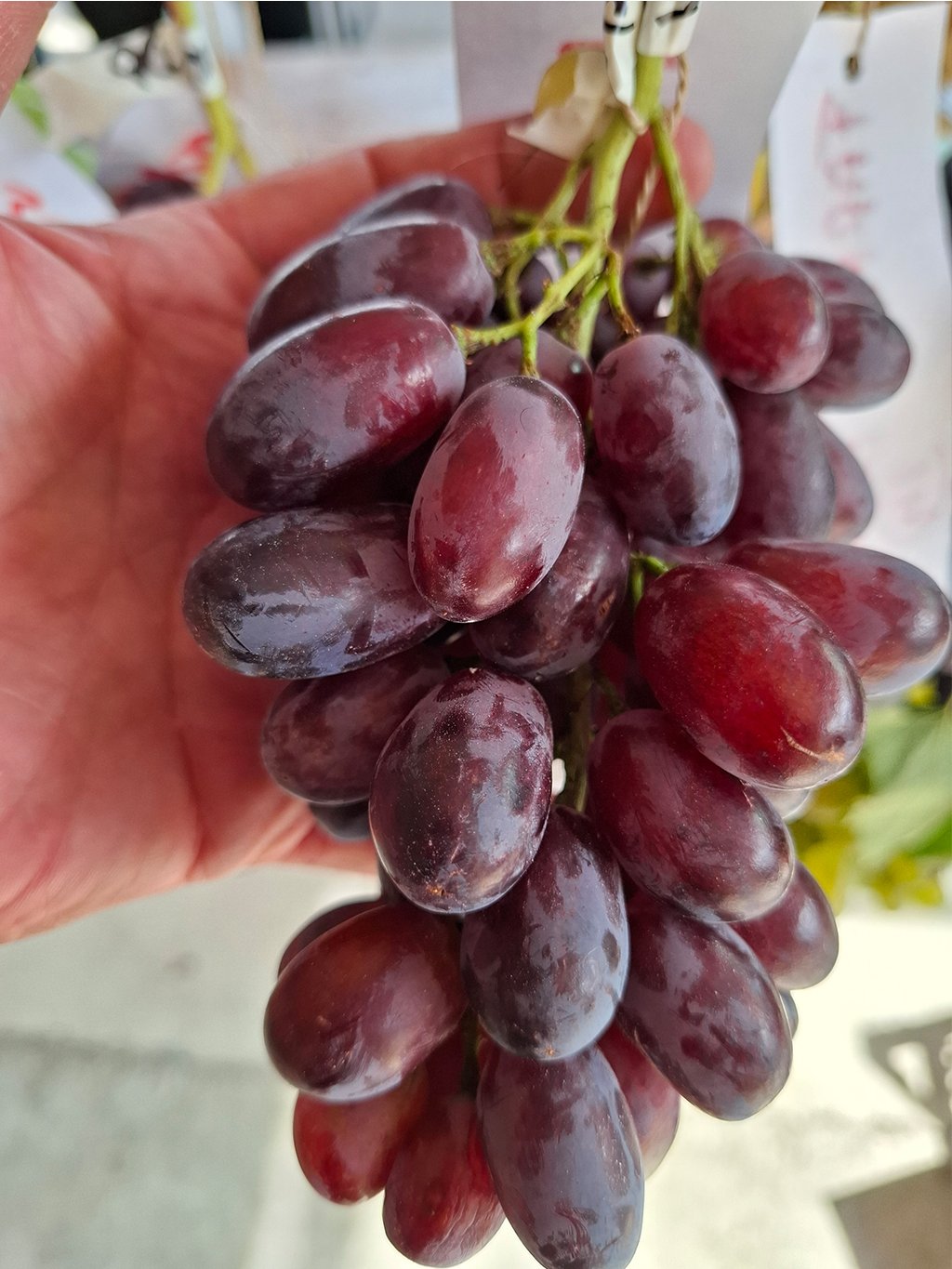 Termése | Fürtjei nagyok, 600 - 1000 g, a legnagyobbak akár 2 kg, lazák. Bogyói nagyok vagy nagyon nagyok, 14 - 16 g, hosszúkásak. Húsos, roppanós, lédús. Bőre közepesen vastag, fogyasztás közben alig észrevehető. Íze kellemes, harmonikus, édes. Cukortartalma 17-18°NM. |