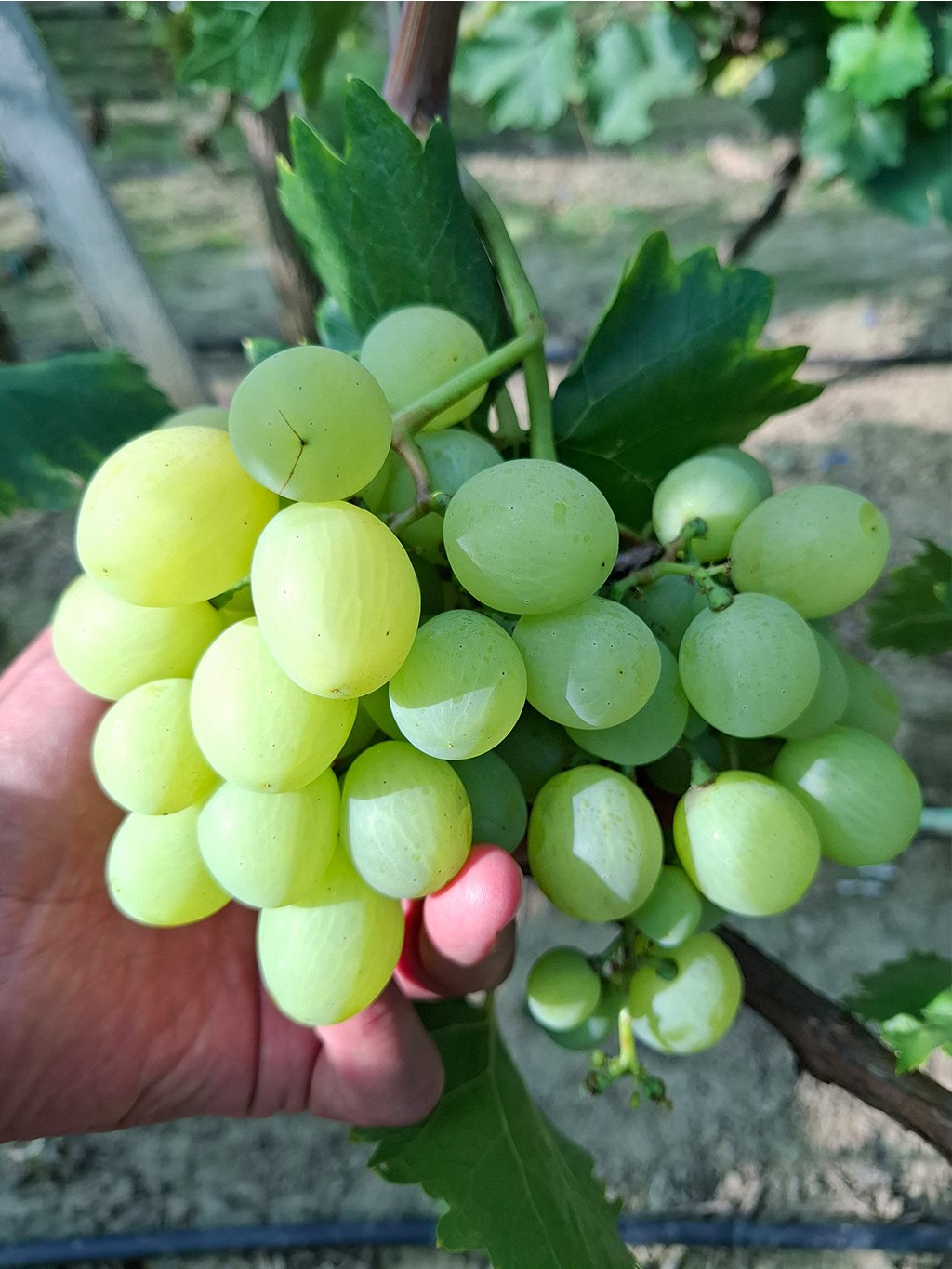 Termése | Fürtjei nagyok vagy nagyon nagyok, 1000 - 2000 g, közepesen tömöttek, kúp alakúak. Bogyói nagyok, de akár óriásiak is lehetnek, 15 - 25 g, oválisak - tökéletes körülmények között némelyek elérhetik a 40 g-ot is! Húsos, roppanós. Bőre vékony. Íze harmonikus, frissítő. Cukortartalma 18-20°NM. |