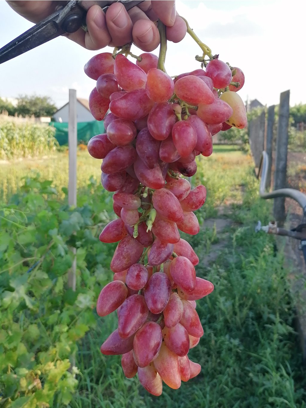 | Termése | A bogyók és a fürtök mérete is extrém nagy. Fürtjei gyönyörűek, nagyok, 1 - 1,5 kg között mozognak, közepesen lazák. A bogyók mérete szintén nagy, 20 g körül és afelett, csúcsos ovális formájúak. Az egyes bogyók hossza átlépi az 5 cm-t. Húsos, lédús, roppanós. Ilyen bogyóméret mellett figyelemreméltó a kiváló harmonikus íz és a roppanós konzisztencia is. Cukortartalma 17-19°NM. |
