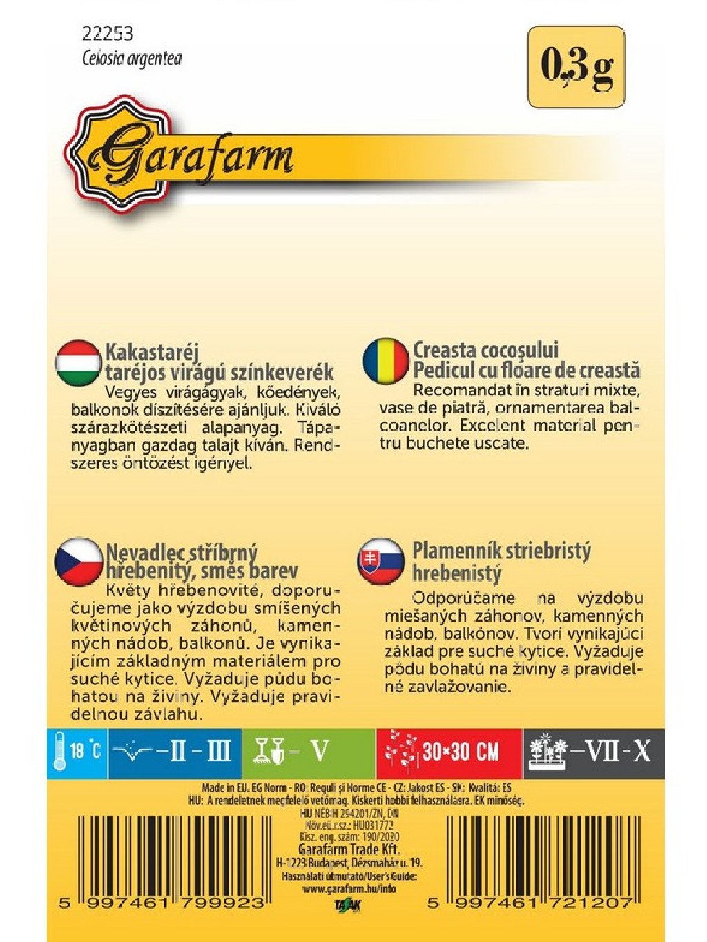 Výsev: od februára až do marca, ideálna teplota pôdy je 18°C. Odporúčaný spon medzi rastlinami je 30 x 30 cm.