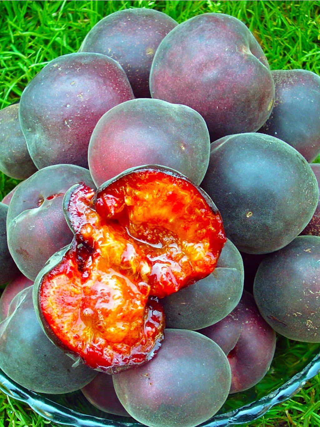 | Plody | sú trošku podlhovasté, fialovej farby hodvábneho dotyku. Dužina je krvavo – zlatožltej farby, v plnom dozretí je medovo sladká, aromatická. |
