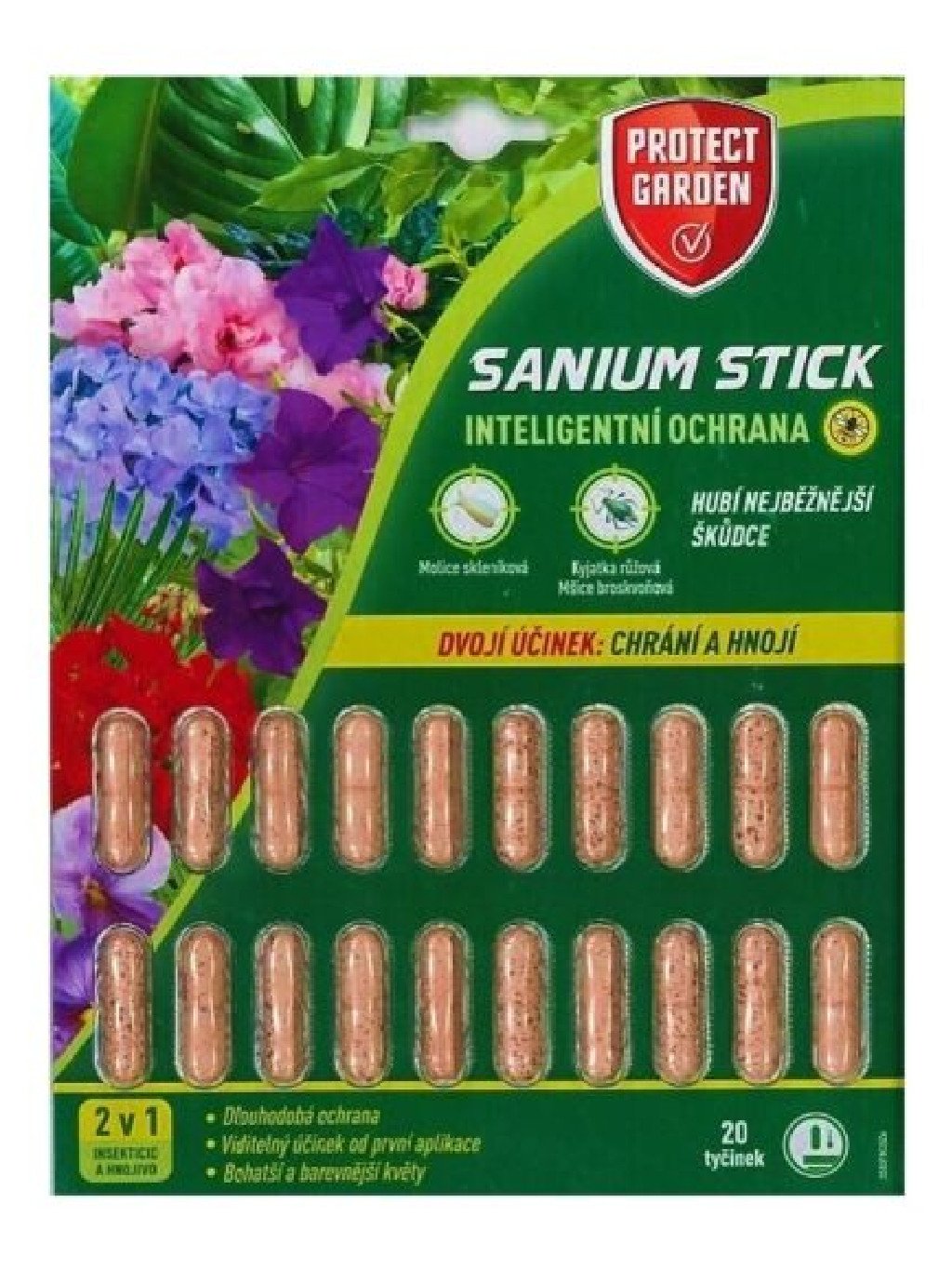 Sanium Stick z radu PROTECT GARDEN je určený na ochranu izbových okrasných rastlín pestovaných v kvetináčoch a hrantíkoch v byte a zimných záhradách proti savým škodcom - vošky a molice. Účinná látka flupyradifuron je ľahko prijímaná korene rastlín a ich ďalej distribuovaná do nadzemných častí. Prípravok taktiež dodáva rastlinám všetky základné živiny a obsahuje špecifické látky (výťažok z morských rias, humínové látky, extrakt z cukrovky), ktoré zlepšujú celkový vzhľad rastliny (zelená farba, olistenie, rýchlejší rast, lepšie kvitnutie). Prvé príznaky účinku na vošky sú viditeľné za 7 dní, na molica za 14 dní. Účinná látka flupyradifuron účinkuje až 9 týždňov.
