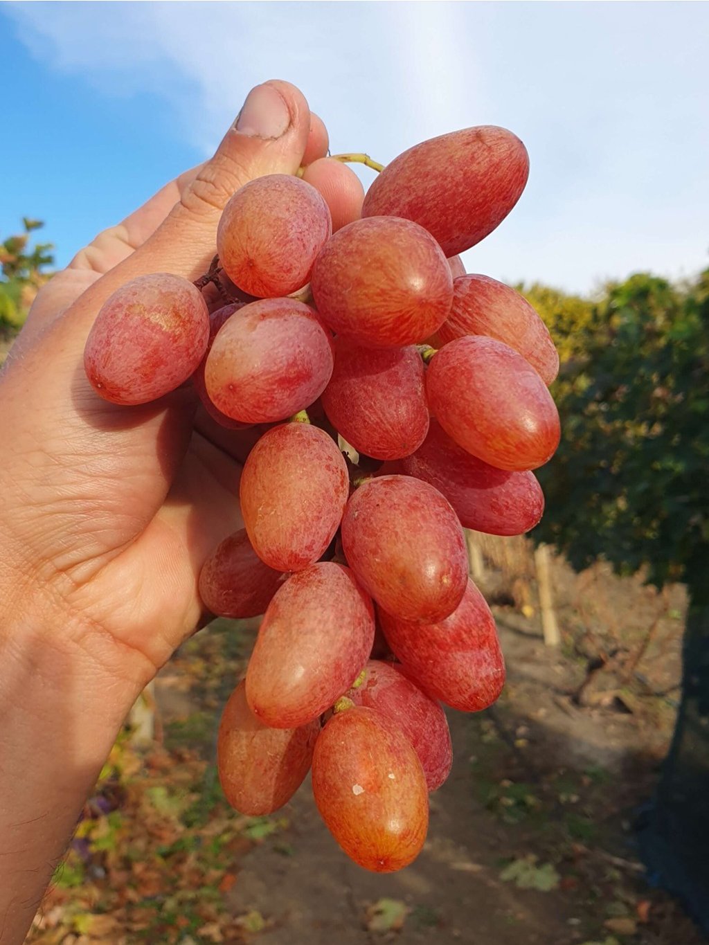 Plody | Strapce sú veľké, 700 - 1200 g, voľné, dekoratívne. Bobule sú veľké, 16 - 20 g, oválne. Dužina je hustá, chrumkavá. Šupku pri konzume takmer necítiť. Chuť je príjemná, harmonická, jemne muškátová. |