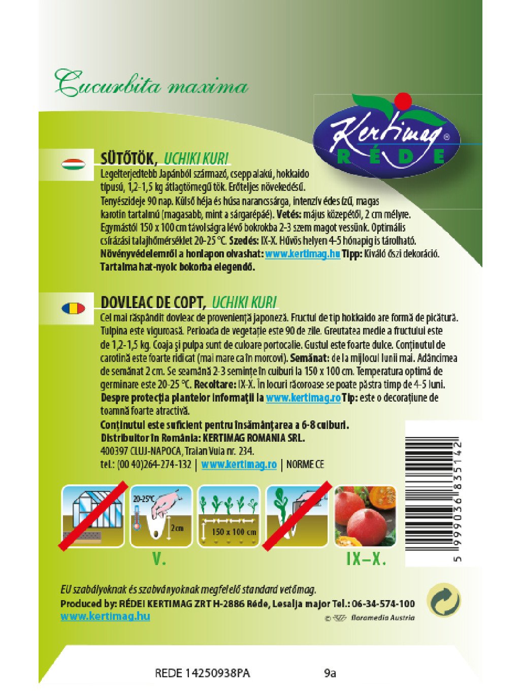 Výsev: v máji, ideálna teplota je 20-25°C. Doporučovaná vzdialenosť riadkov je 150 cm, vzdialenosť semien 100 cm.