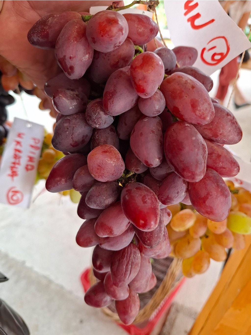 Plody | Strapce sú veľké, 600 - 1500 g, kónické, stredne voľné. Bobule sú veľké, dlhé, špicaté s hmotnosťou do 16 g. Dužina je chrumkavá a mäsitá. Chuť je bohatá, veľmi sladká, harmonická. Cukornatosť 17-21°NM. |