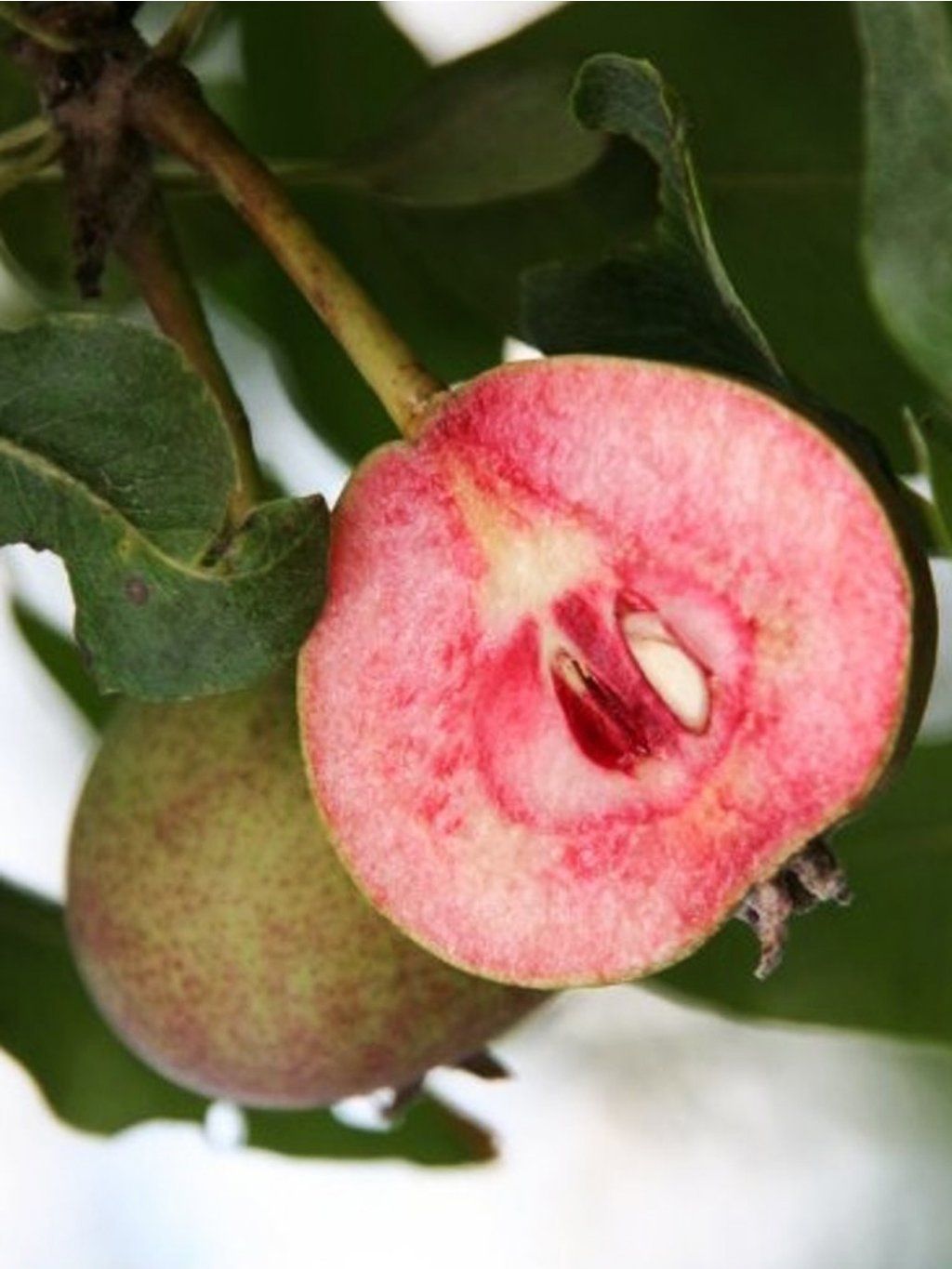 | Plody | sú stredne veľké. s mierne asymetrickým hruškovitým tvarom. Základná farba šupky je zelená, na slnečnej strane s červeným líčkom. Dužina je rovnomerne červeno mramorovaná. Chuť je typicky trpkejšia. |